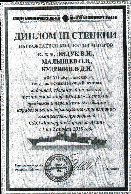 Сотрудники отделения трансфера перспективных междисциплинарных технологий Вячеслав Эйдук и Олег Малышев приняли участие в научно-технической конференции «Состояние, проблемы и перспективы создания корабельных информационно-управляющих комплексов», прошедшей в ОАО «Концерн «Моринсис-Агат». Представители Крыловского центра выступили с докладом «Математическое обеспечение подсистемы управления гидродинамическим полем в составе корабельной информационно-управляющей системы», который, по результатам оценки экспертов мероприятия, был удостоен Диплома III степени.