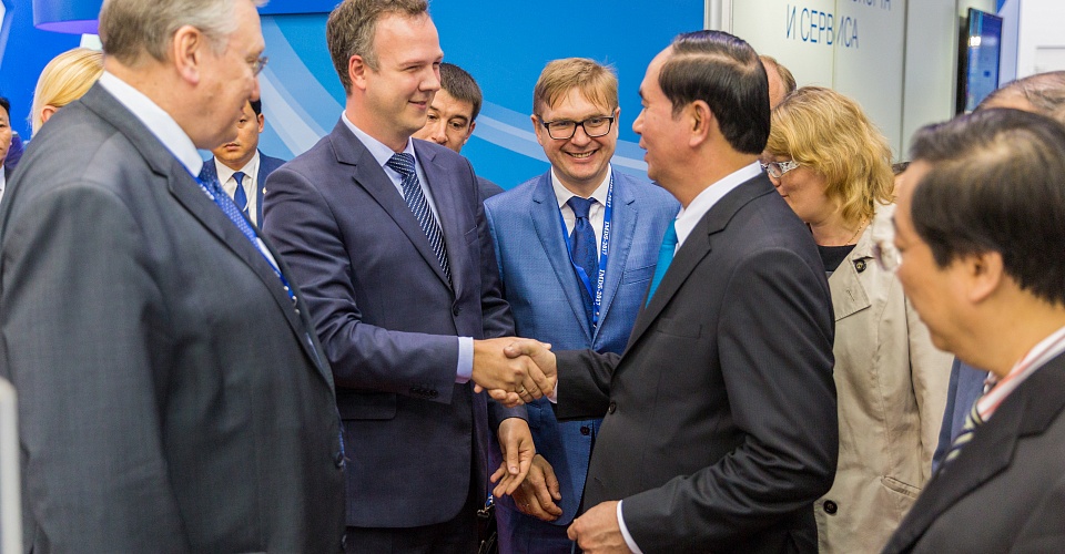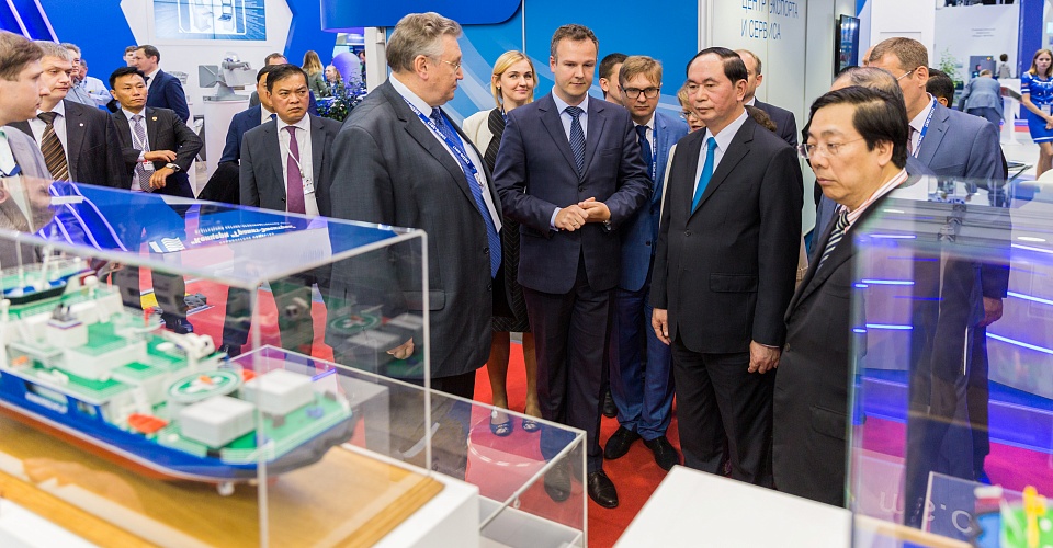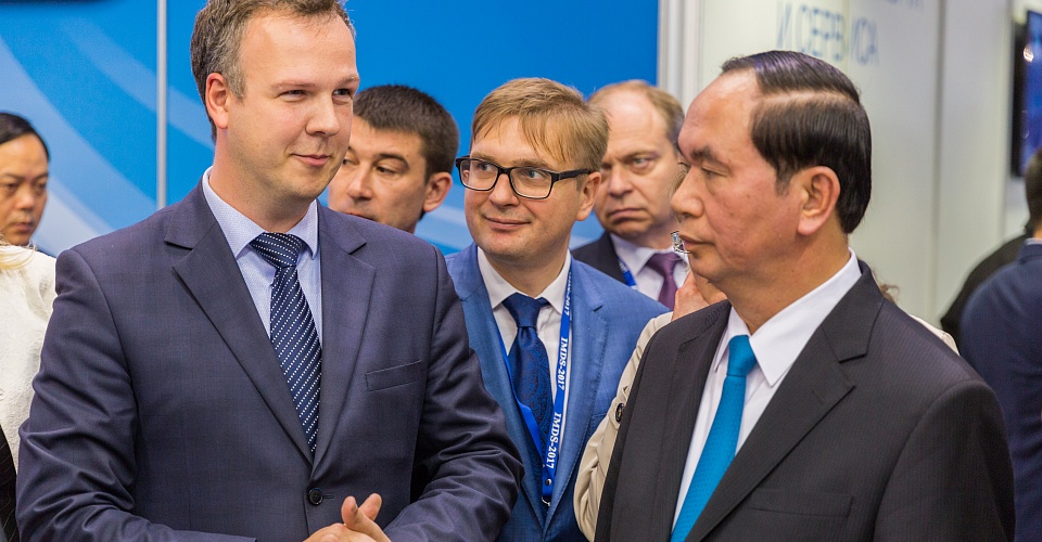 Deputy Prime Minister of the Russian Federation Dmitry Rogozin officially opened the 8-th International Maritime Defense Show, where KSRC is an active participant, on June 29, 2017. During the follow-up tour over the exhibition Dmitry Rogozin, Admiral Vladimir Korolev, Russian Naval Commander-in-Chief, and Boris Kabakov, Director of the Department of Shipbuilding Industry and Marine Technology (Russian Federation Ministry of Industry and Trade) have visited KSRC stand displaying the projects of advanced naval ships. The most highlighted showcases considering the recent statements of Deputy Minister of Defense Yuri Borisov and Deputy Naval Commander-in-Chief for naval armament Vice Admiral Victor Barsuk, were the projects of aircraft carrier «Shtorm» and general-purpose amphibious assault ship «Priboi». KSRC Director General Vladimir Nikitin and the Head of Naval Ship Systems’ Integration Division of KSRC Vladimir Pepelyaev gave all necessary clarifications to the distinguished guests. KSRC was also visited by members of official foreign delegations from various military departments, and heads of shipbuilding enterprises. In particular, the President of Vietnam Mr. Tran Dai Quang was acquainted with KSRC projects and acknowledged the level of excellence in the design of marine technologies for civil and military applications. His high interest was particularly attracted to KSRC designs of air-independent power plants — the key element of non-atomic submarine of new generation.