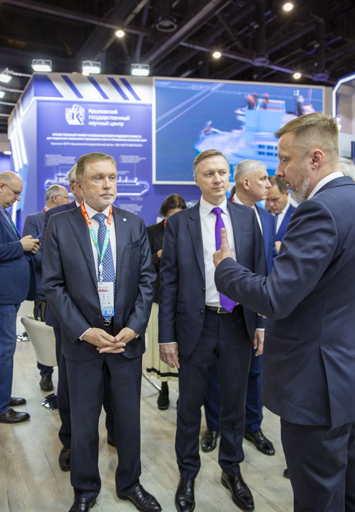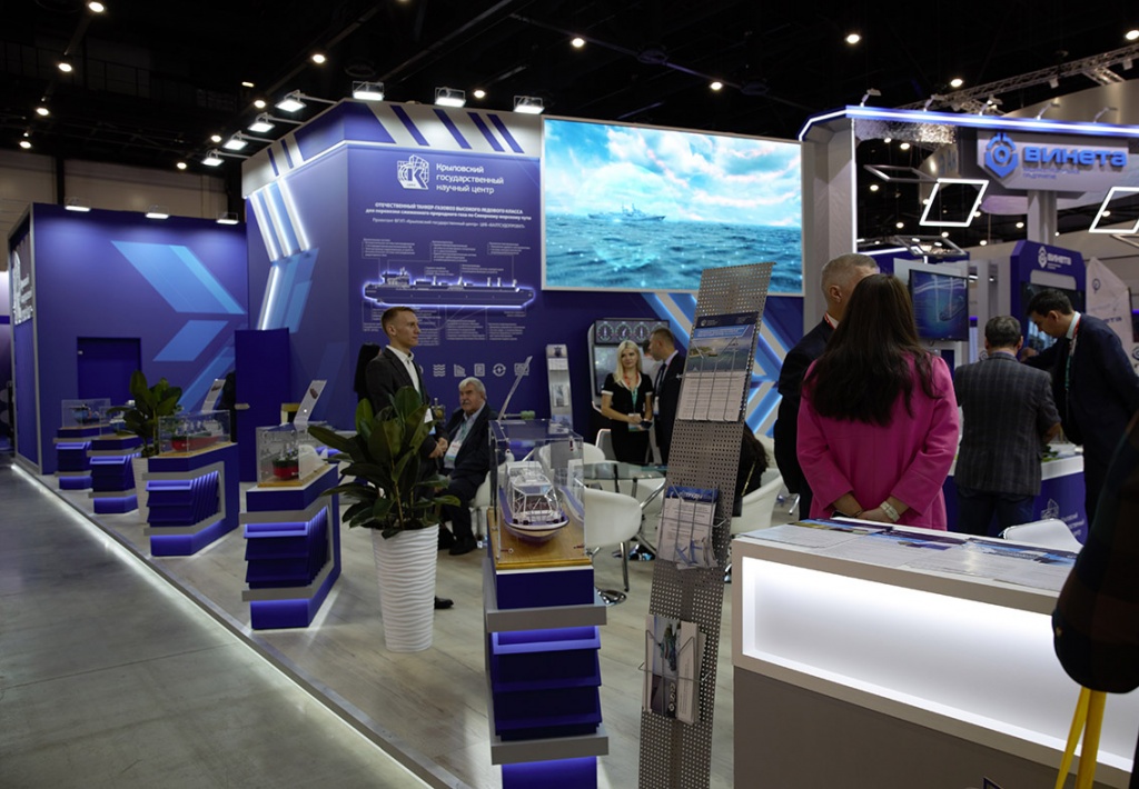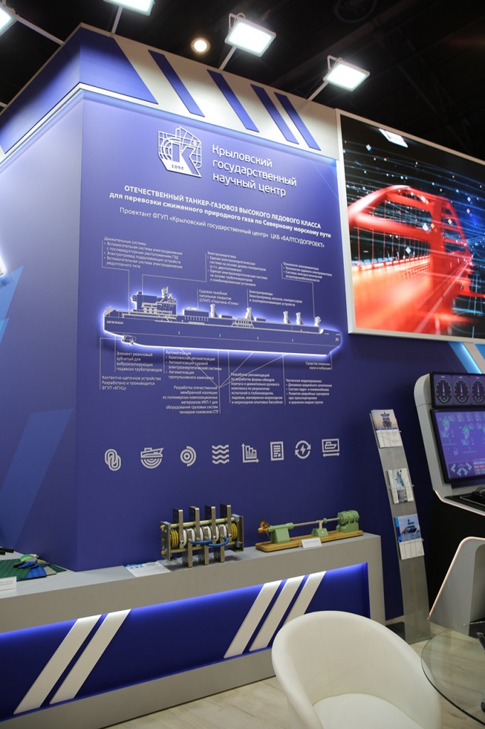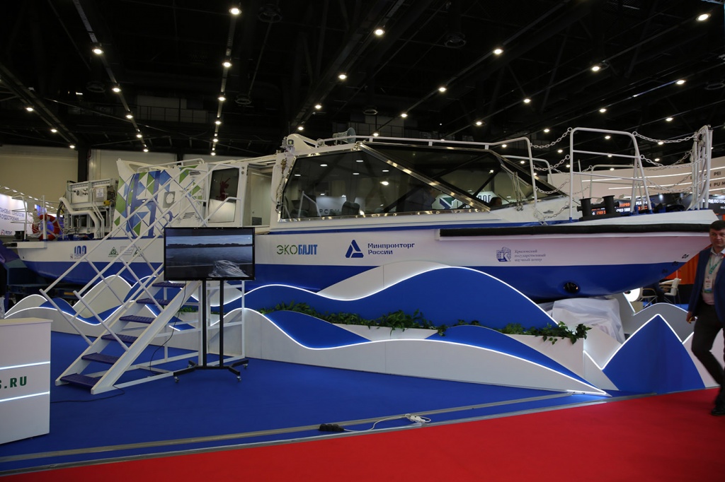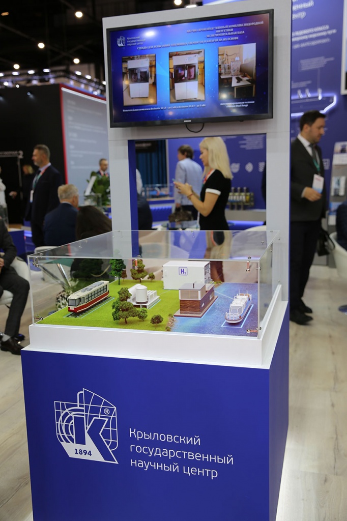Экспозиция Крыловского научного центра расположилась на двух площадках: в павильоне F собственно стенд и в павильоне G прогулочно-экскурсионное судно (ЭКОБАЛТ) проекта 00393, работающее на водороде, включенное по экспертным оценкам накануне открытия выставки в Топ-8 наиболее значимых ее экспонатов.