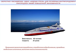По словам Евгения Апполонова, могут быть созданы проекты судов 3 типов: для плавания по небольшим рекам и каналам, для перевозки пассажиров по Неве, и для выхода в акваторию Финского залива. Причем на этих судах будет возможна реализация ряда инновационных решений, которыми располагает научный центр.
